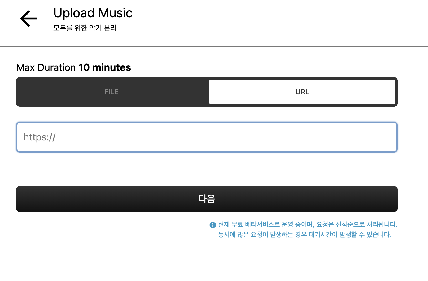 2. 악기 분리 > URL 클릭 > 유튜브 영상 붙여넣기