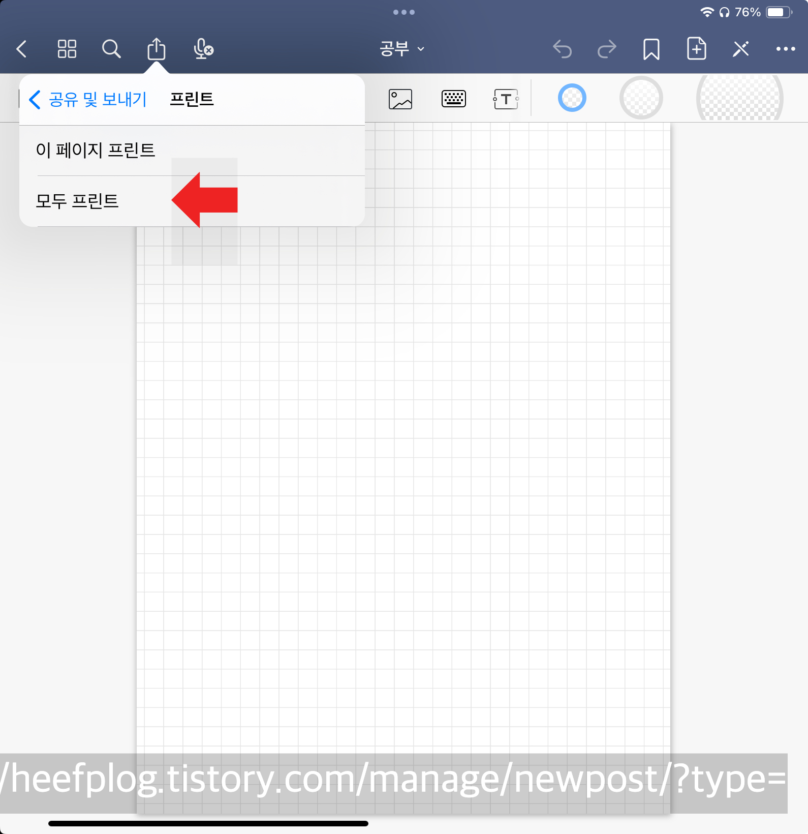 그럼 이렇게 공유 및 보내기 탭이 활성화됩니다. 프린트 버튼을 눌러주세요.