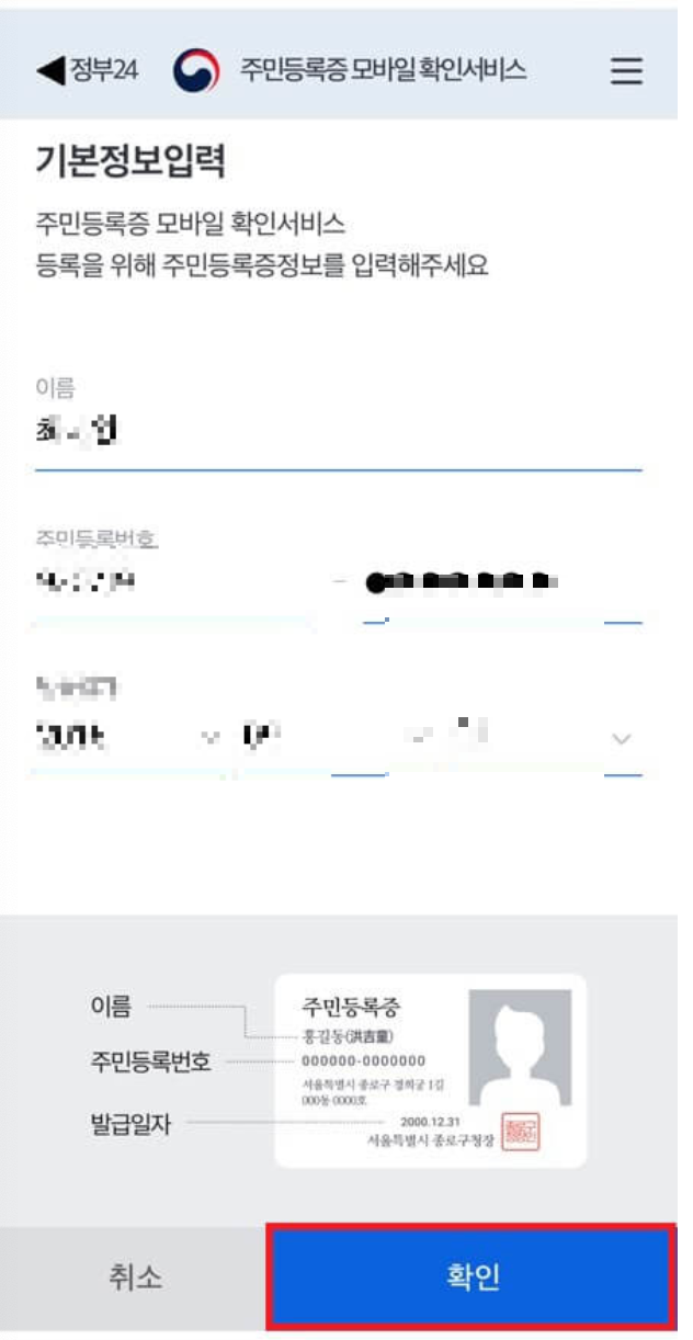 그 다음 주민등록증 모바일 확인을 위해 개인정보를 입력해주세요.