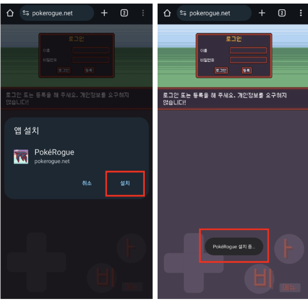 그러면 앱 설치 팝업이 뜹니다. 설치를 클릭하면 내 핸드폰에 모바일 포켓로그가 설치되어 있는 것을 볼 수 있습니다.