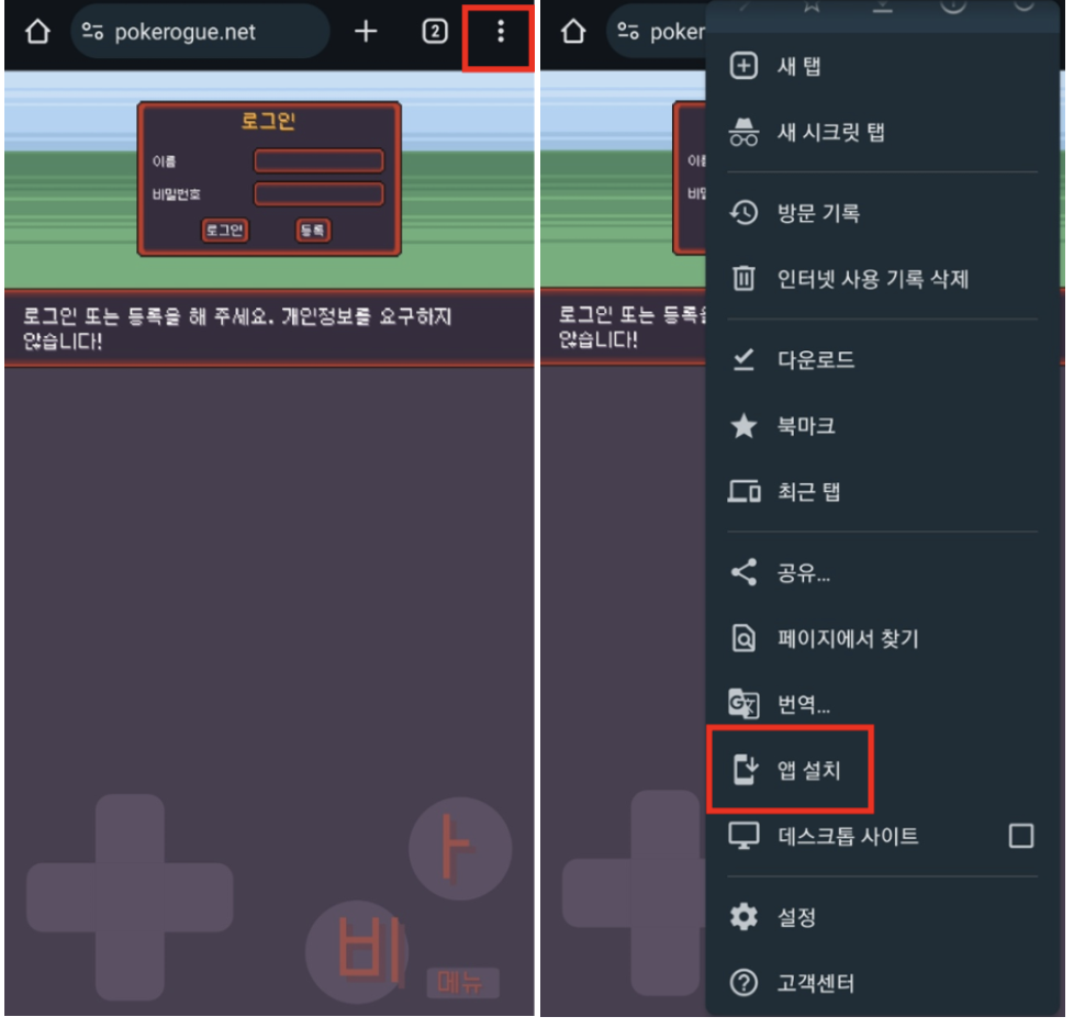그 다음 우측 점 세개를 클릭 > 앱 설치를 눌러줍니다.