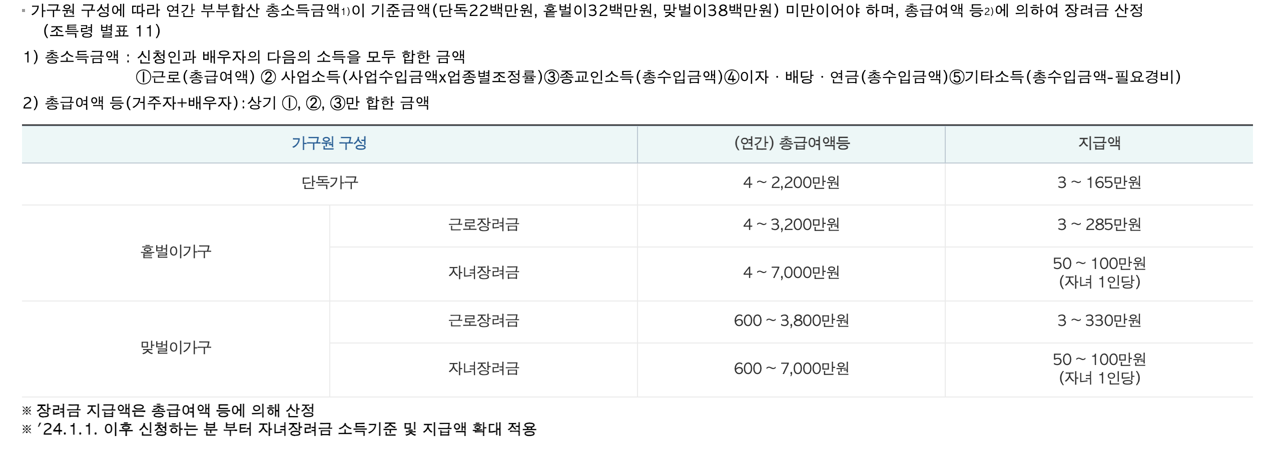 ✅ 2023.12.31일 현재 거주자(배우자 포함)가 계속 근무하는 상용근로자로서 월 평균 총급여액 500만원 이상인 자(근로장려금만)